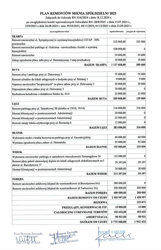 - Korekty planu gospodarczo finansowego SM „Czuby” w Lublinie na 2025 r. dotyczącego planu mienia Spółdzielni 2025 r. w pozycji „Remont parkingu przy ul. Tatarakowej 29 w osiedlu „Łęgi” w wysokości 36 000,00 zł.